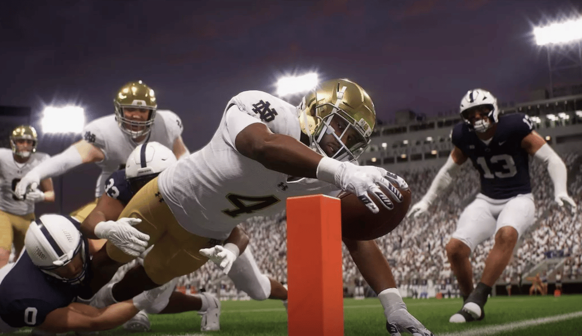 Notre Dame running back Jeremiyah Love’s digital replica stretches for a touchdown in this promotional image from EA’s College Football 26 video game. (EA)